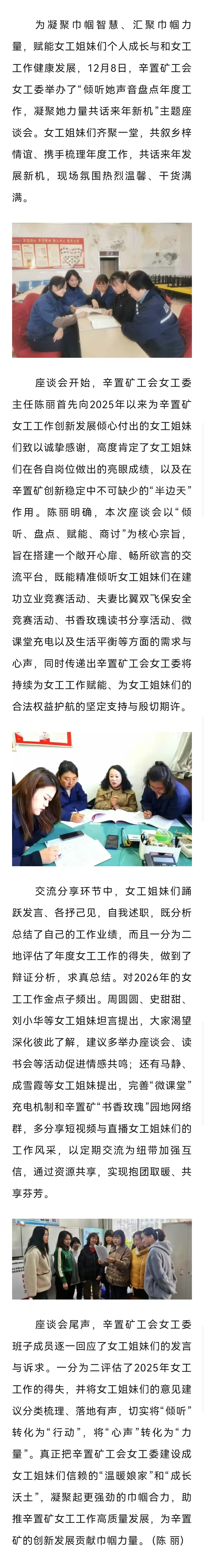 【基层动态】辛置矿工会女工委举办“倾听她声音盘点年度工作,凝聚她力量共话来年新机”座谈会