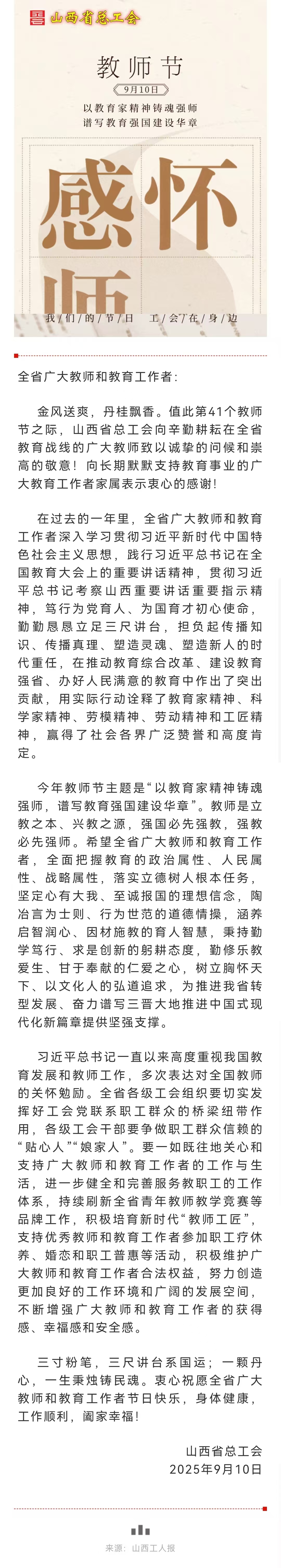 山西省总工会致全省广大教师和教育工作者的慰问信