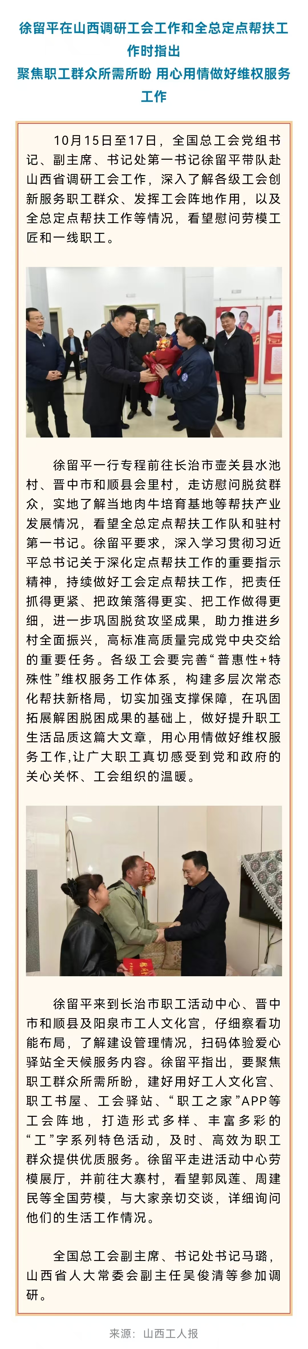 徐留平在山西调研工会工作和全总定点帮扶工作