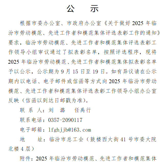 关于做好2025年临汾市劳动模范、先进工作者和模范集体评选表彰工作的通知